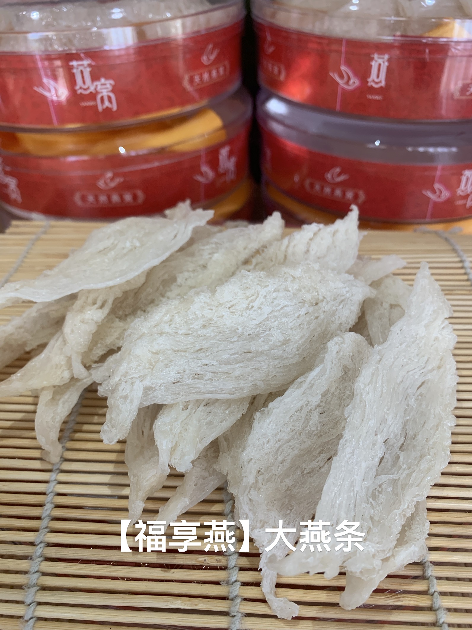 产品介绍:采摘后较多毛的燕盏在挑完毛后,燕丝无法形成盏型,就成为燕条。其香味和口感稍差,但营养价值是一样的,由于卖相较差,故价位较燕盏低。燕条纹理密实,色泽晶莹,口感细腻润滑,燕条、燕角因较完整,营养价值应比燕丝、燕碎更高一些