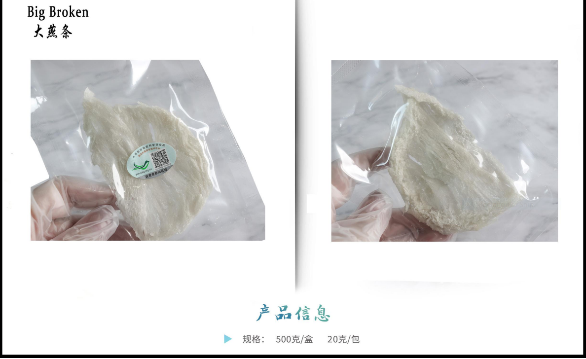 产品介绍:采摘后较多毛的燕盏在挑完毛后,燕丝无法形成盏型,就成为燕条。其香味和口感稍差,但营养价值是一样的,由于卖相较差,故价位较燕盏低。燕条纹理密实,色泽晶莹,口感细腻润滑,燕条、燕角因较完整,营养价值应比燕丝、燕碎更高一些